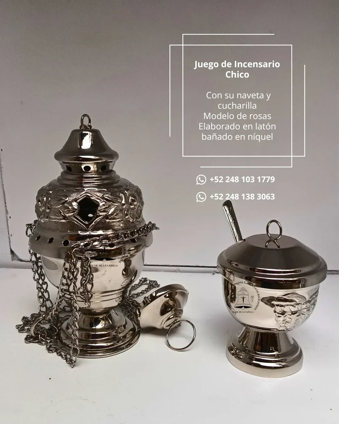 Modelo de rosas, con naveta y cucharilla, elaborado en latón bañado en níquel